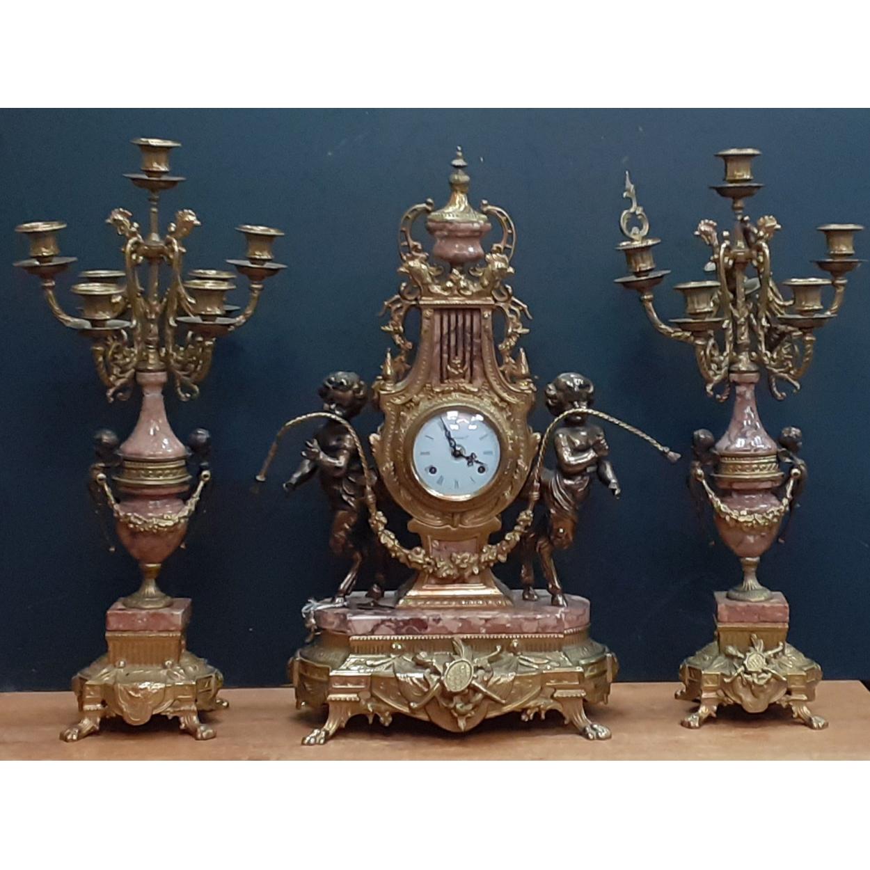 A large ANTIQUE Italian Franz Hermle brass set mantle clock with pink marble candelabra garnitures, renowned for their excellent timekeeping. One arm is missing and one broken-off but included from the same garniture. The other garniture has some slight damage to the marble - irrespective of the historical damage this clock would make an elegant addition to your home! Clock comes with a key - clock is in working condition. Dimensions of main clock 18" width x 25" height approx