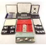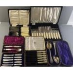 Six cased cutlery sets to include Firths 6 knives and forks, cased Berry spoons, knife and jam spoon with mother of pearl handles, and others. A good useable lot in six boxes