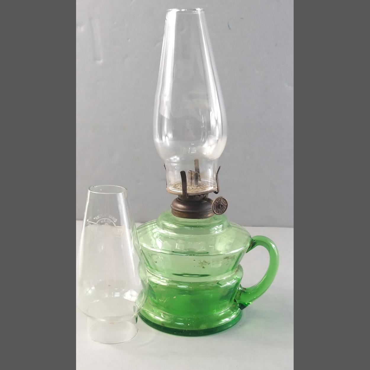 A wee Willie Winkie style green glass antique oil lamp with handle. Standing 25cm tall. With spare funnel.