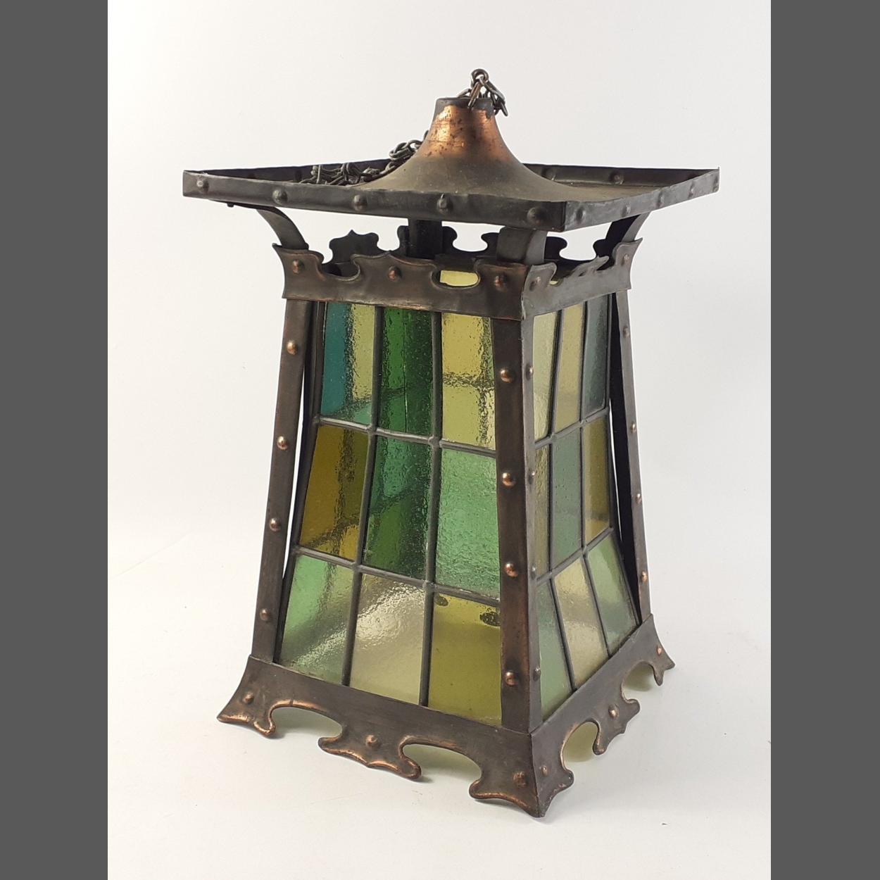 Arts & Crafts style copper and stained glass pendant hanging lantern. 33cm tall approx. Only one glass section noted with a crack, all other glass good.