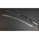 A modern reproduction Samurai sword and katana mounted on a display plinth. Sword has 48cm blade approx, katana 28cm approx