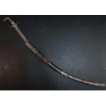 A vintage SHAMSHIR Persian curved sword. Blade length 80cm approx. Wear to scabbard and handle. Some rusting noted to blade. Weight of item excluding scabbard 700g approx.