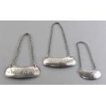 Three decanter labels with incomplete marks. Visible marks are for Edinburgh, makers Walter & Patrick Cunningham (1778-1807) with associated duty marks. Total weight 20g approx