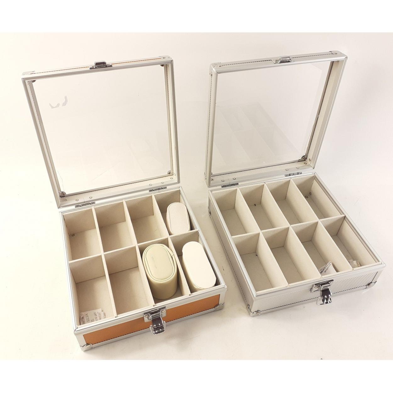 Two metallic eight section watch display cases with 3 cushions. Each measures 20x20x8cm approx
