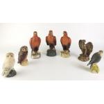 A collection of empty whisky decanters to include 2 BESWICK Beneagles golden eagles, a Whyte & Mackay ROYAL DOULTON golden eagle, a Whyte & Mackay snowy owl, tawny owl and merlin plus a cast Napoleonic eagle with damage