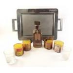 GLENMORANGIE SINGLE MALT SCOTCH WHISKY polished stainless steel serving tray with handles dimensions 48cm width x 34cm height approx with a collection of four vintage brown glass whisky tumblers and matching Ballantines decanter bottle and two crystal glass whisky tumblers