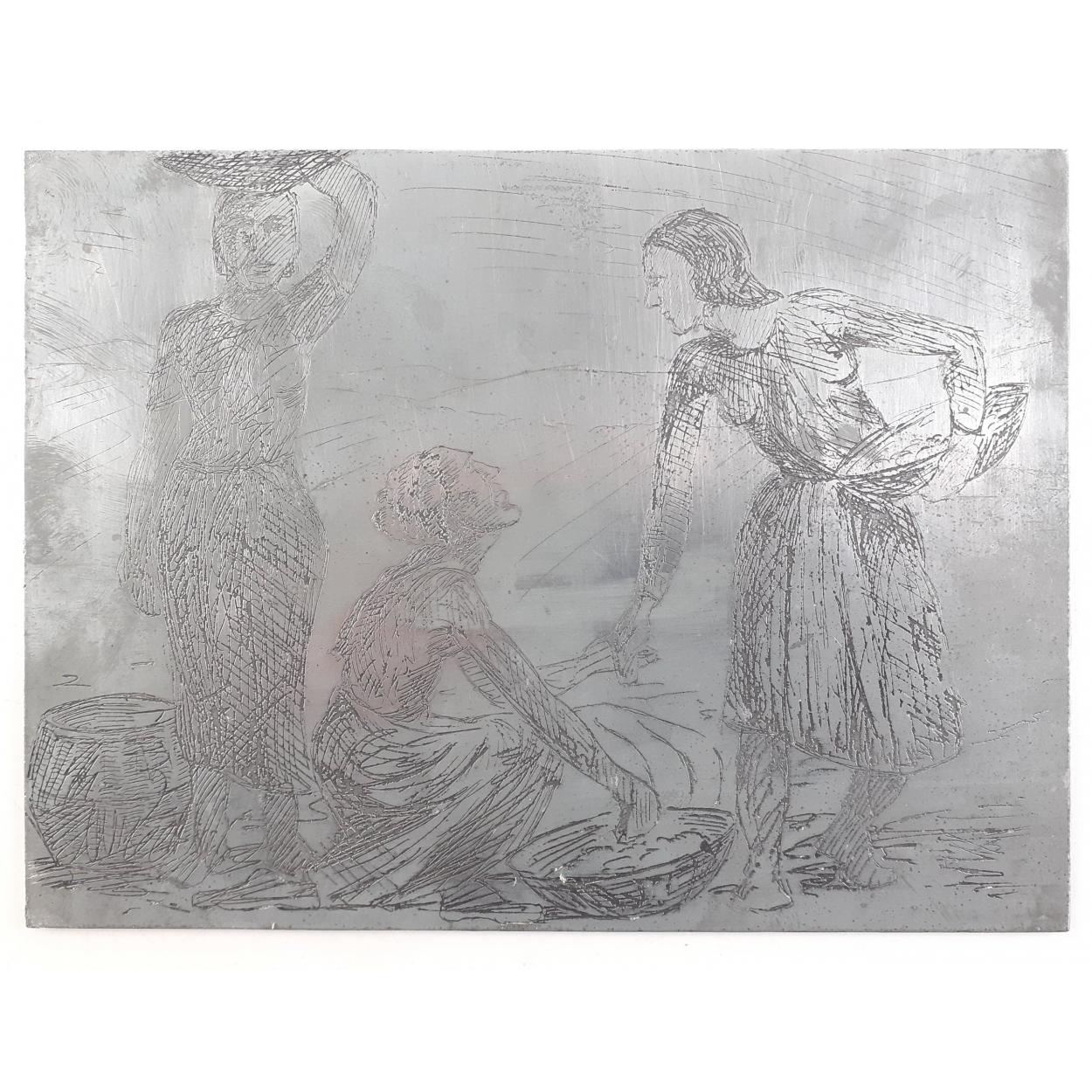 An ETCHED steel metal plate depicting women washing by a river scene used as a template to print from - dimensions 20.5cm x 15cm approx