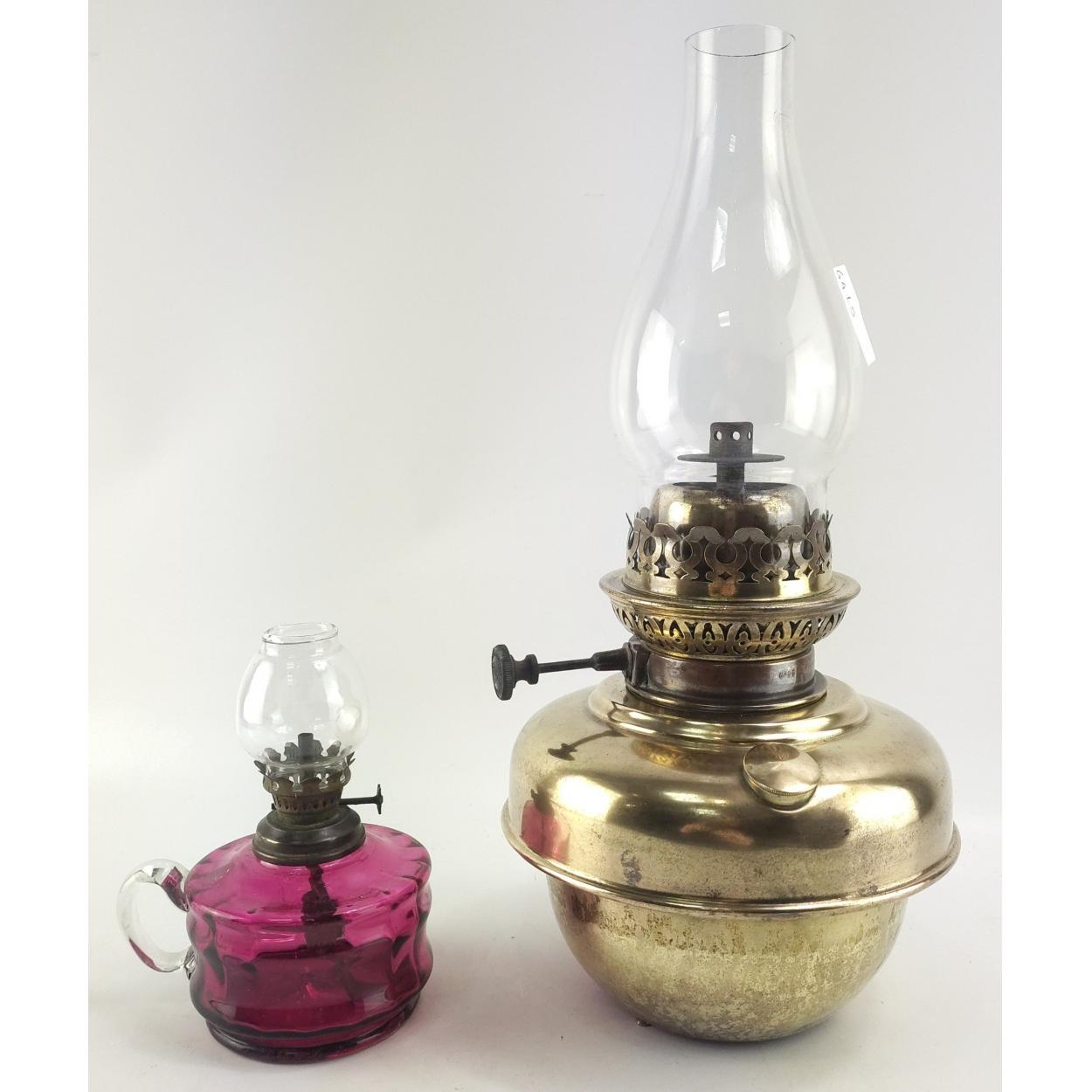 Two oil lamps. One with cranberry reservoir (crack to base but looks still useable) other with brass reservoir (adjuster stamped "LAMPE VERTITAS". Approx 39cm including chimney). Both with chimneys