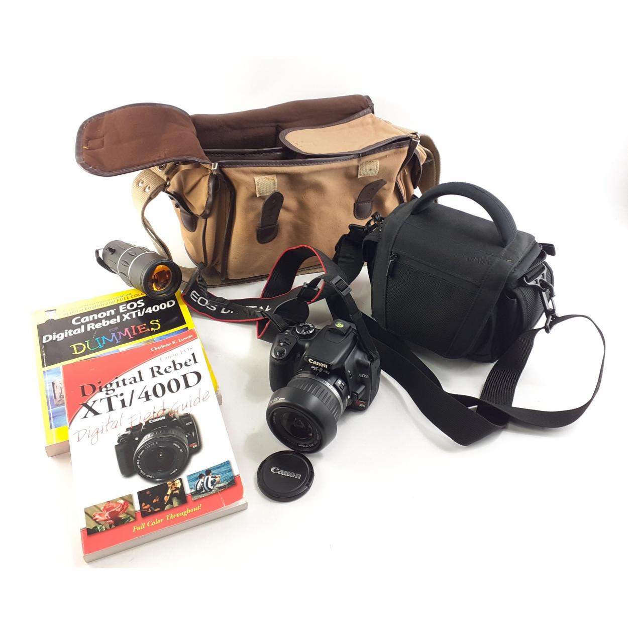 CANON EOS REBEL XTI with Canon EF-s 18-55mm Zoom Lens in super condition complete with two batteries & Charger, two SD cards (1 new) and case. Comes with two manuals on how to maximise the camera. Also an Atlas 8x40 Monocular and a quality Billingham camera case.