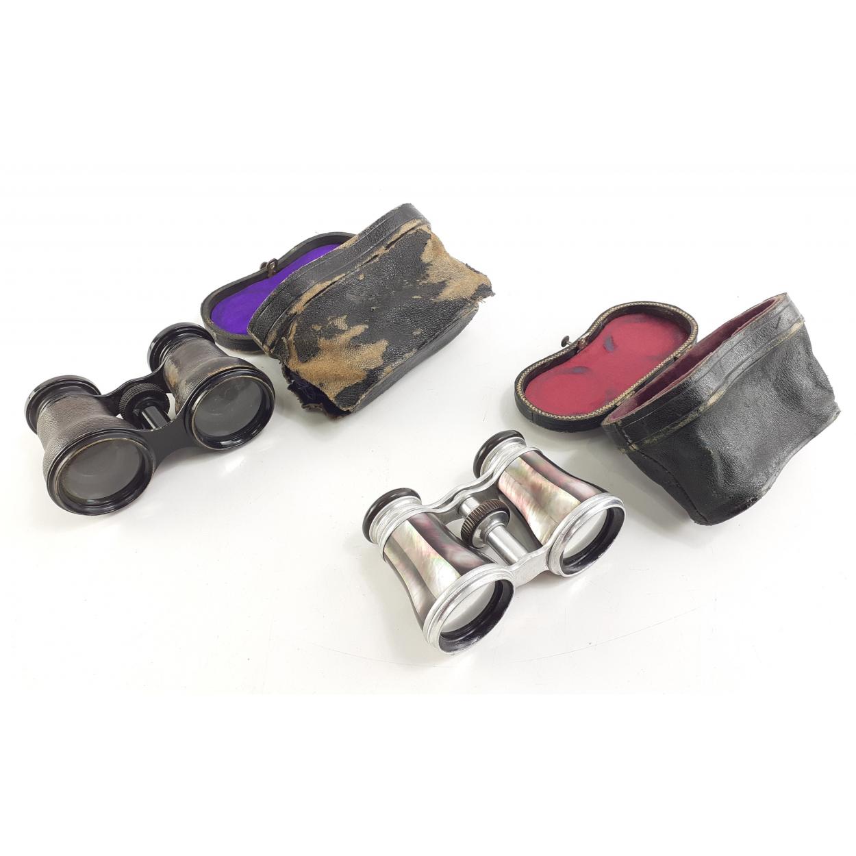 LEMAIRE PARIS classy Mother of Pearl style Opera Glasses in case. Finish in good order, winder not working but they do pull out. With one other set of cased glasses.