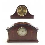 Two wooden mantle clocks. Both unmarked. Clock with inlay has movement while other is battery operated.