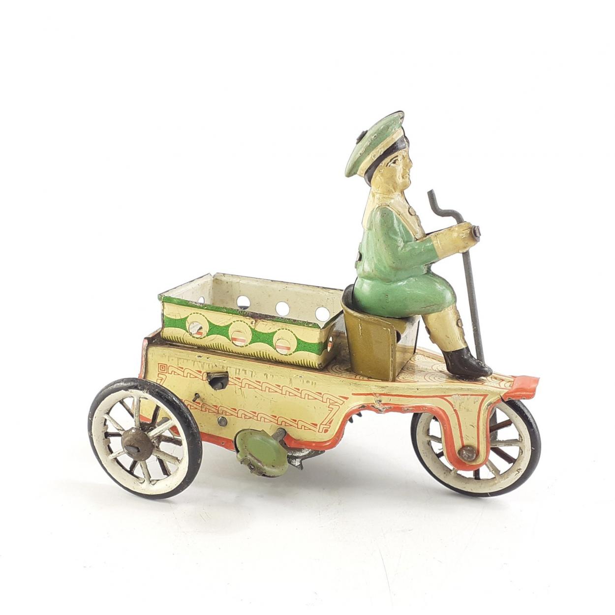 Made in DRGM Germany penny clockwork toy. Child on cart. Does wind but the spring sticks. A lovely little penny toy.