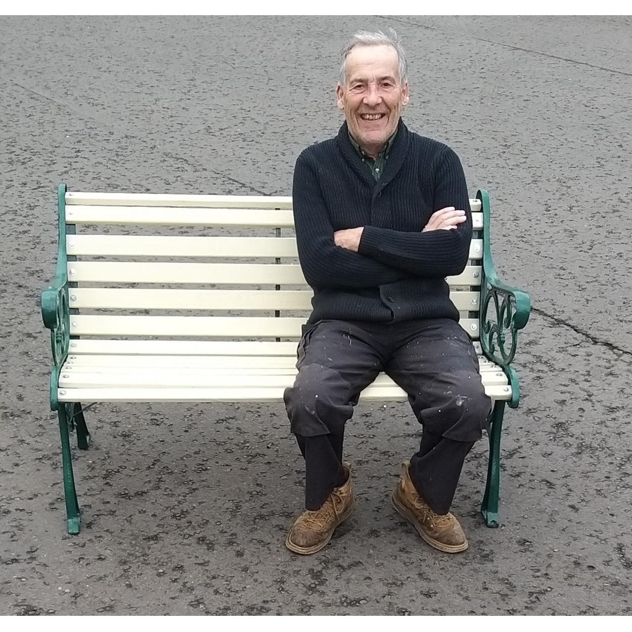 A good quality refurbished wrought iron ended bench in green and green and yellow