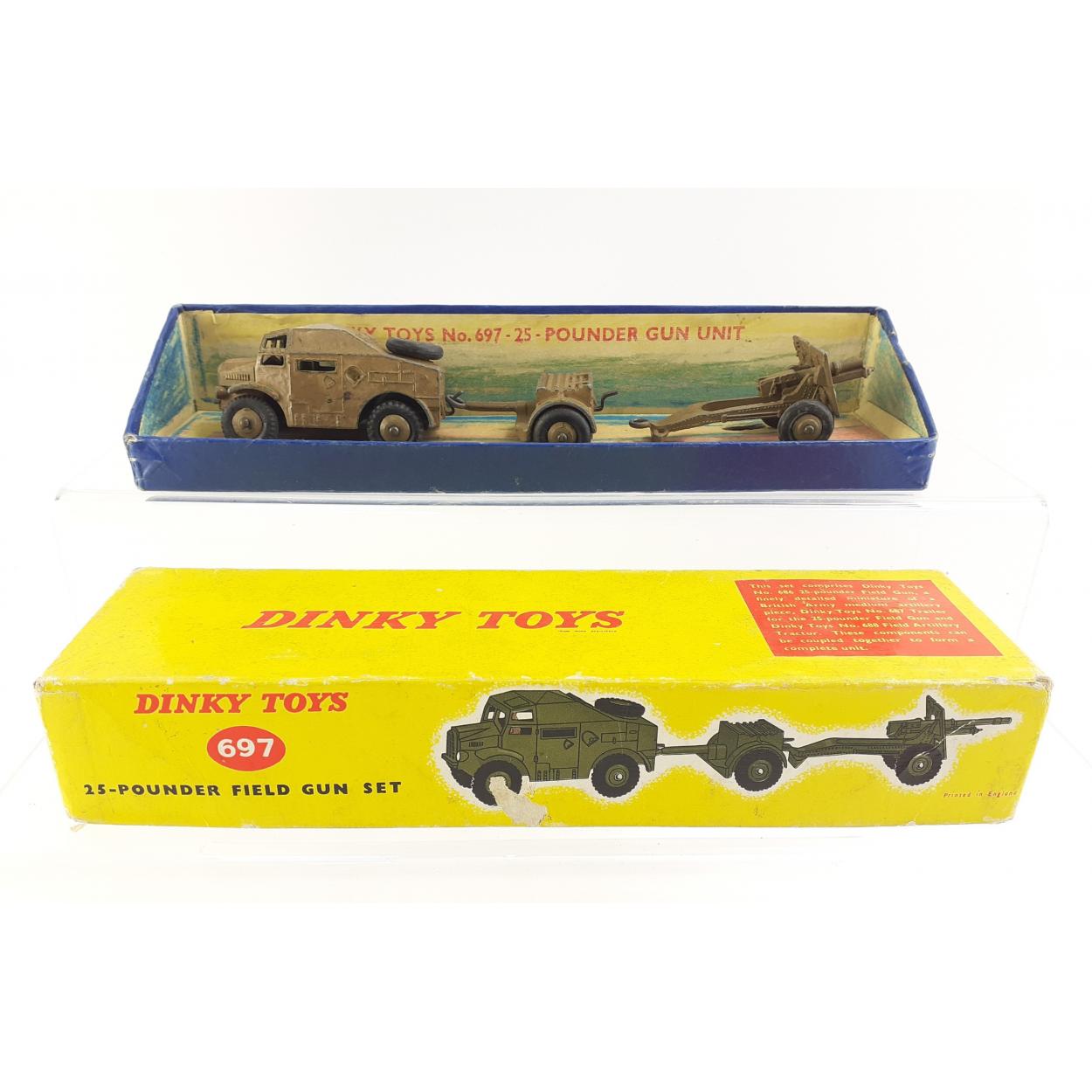 DINKY 697 25 Pounder Field gun set in original box. Note model has been refinished in a desert colour scheme. Still a good piece.