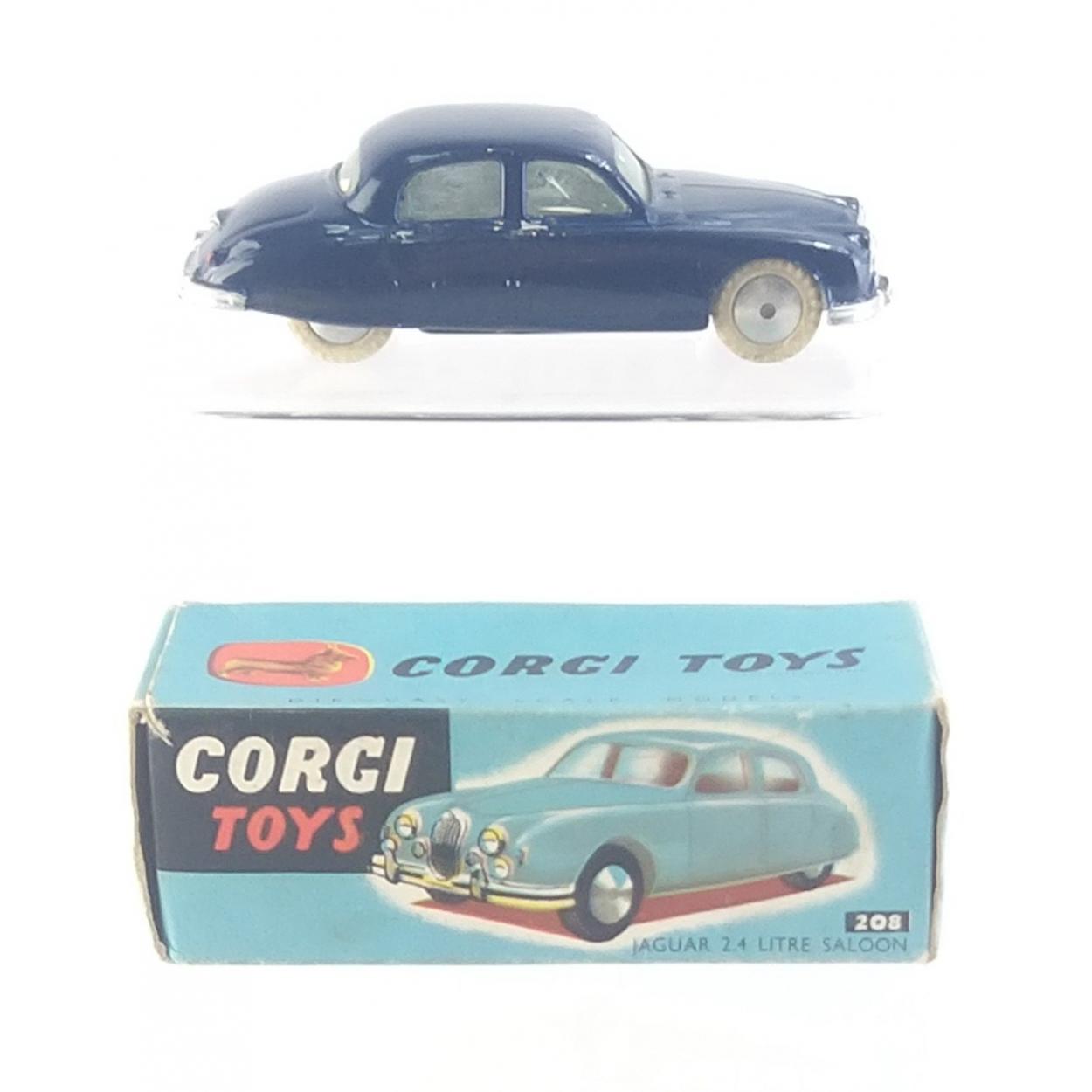 CORGI 208 Jaguar 2.4 Litre Saloon in scarcer blue finish. Minor wear to tyre and screen. Box has name label.