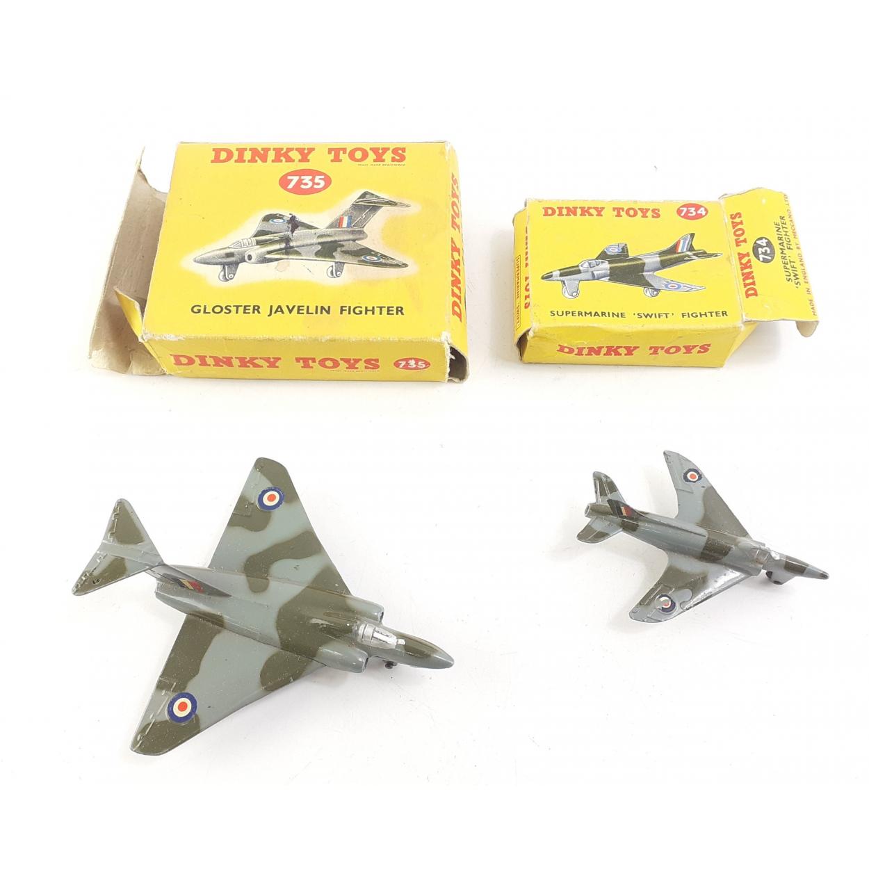 DINKY 734 Supermarine Swift and 735 Gloster Javelin. Both models good, boxes with light wear.