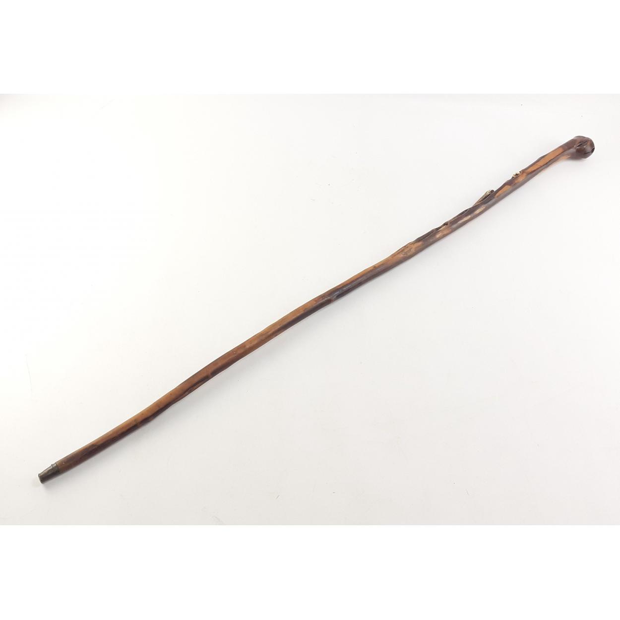 Intriguing carved walking stick with Skull and Snake. A 87cm long stick with inset bone carved snake menacingly heading towards an inset skull. A very scarce piece brought back from Normandy in France during WWII by the vendors Grandfather. A truly superb piece !