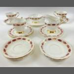 A part PARAGON 'Elegance' tea service in white with red and gilt design, to include 3 cups (1 slight crack), 6 saucers (1 small chip), 5 side plates, 1 cake plate (24cm), 1 milk jug and 1 sugar bowl