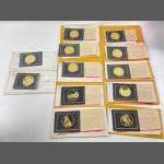 Twelve vintage 1982 24Kt gold-plated coins from THE FRANKLIN MINT, these coins from the Art Treasures of the Prado series, come in the original delivery envelope with all paperwork and each coin unopened. The coins are: issue 1 SELF-PORTRAIT (Albrecht Durer), issue 2 FAMILY OF THE HOLY LAMB, issue no 3 EMPRESS ISABELLA, issue 4 ADORATION OF THE SHEPHERDS, issue 5 LAS MENINAS, issue 6 THE NUDE MAJA, issue 7 THE THREE GRACES, issue 8 DEATH OF THE VIRGIN, issue 9 THE GARDEN OF DELIGHTS, issue 10 THE ANNUNCIATION, issue 11 ARTEMISIA, issue 12 DON GARCIA DE'MEDICI