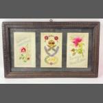 Framed WWI Era hand made Silk postcards. Includes rarer original MGC Machine Gun Corps postcard dimensions of frame 33cm x 20cm approx