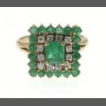 A STUNNING 18 stamped yellow gold Emerald and Diamond studded dress ring size S with 12 diamonds - 21 Emeralds gross weight 7.12g approx - central large Emerald measures 0.5cm square approx - A beautiful example!
