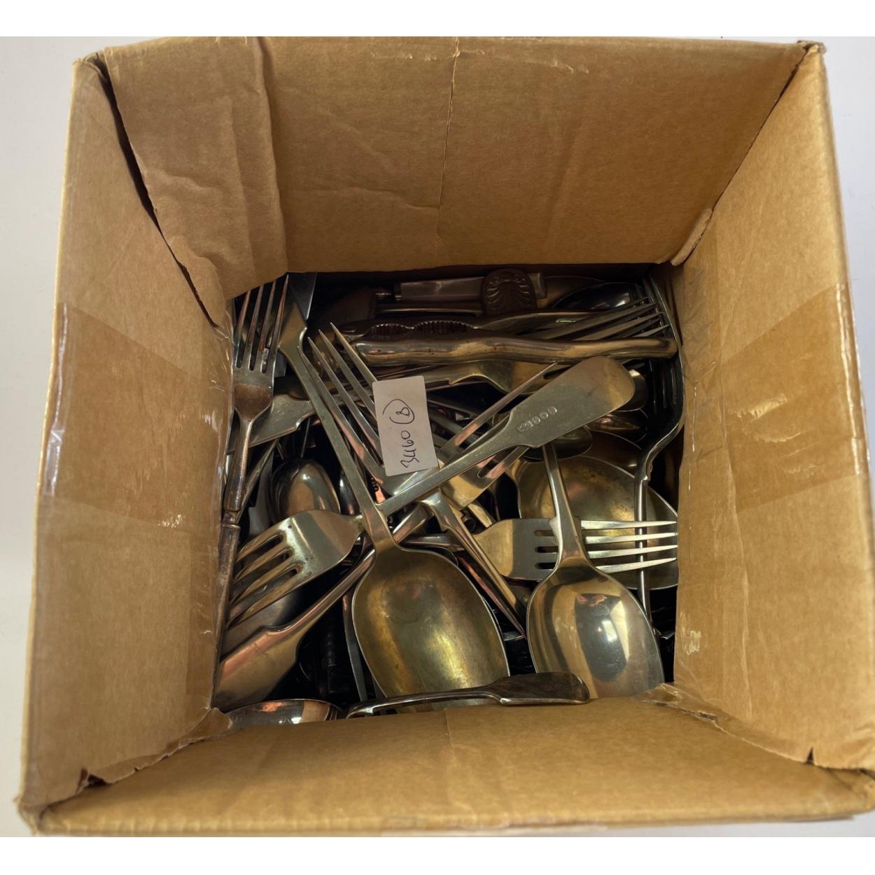 A box of mixed EPNS cutlery including a partial boxed set of 9 fish knives and 12 forks (box in need of repair)