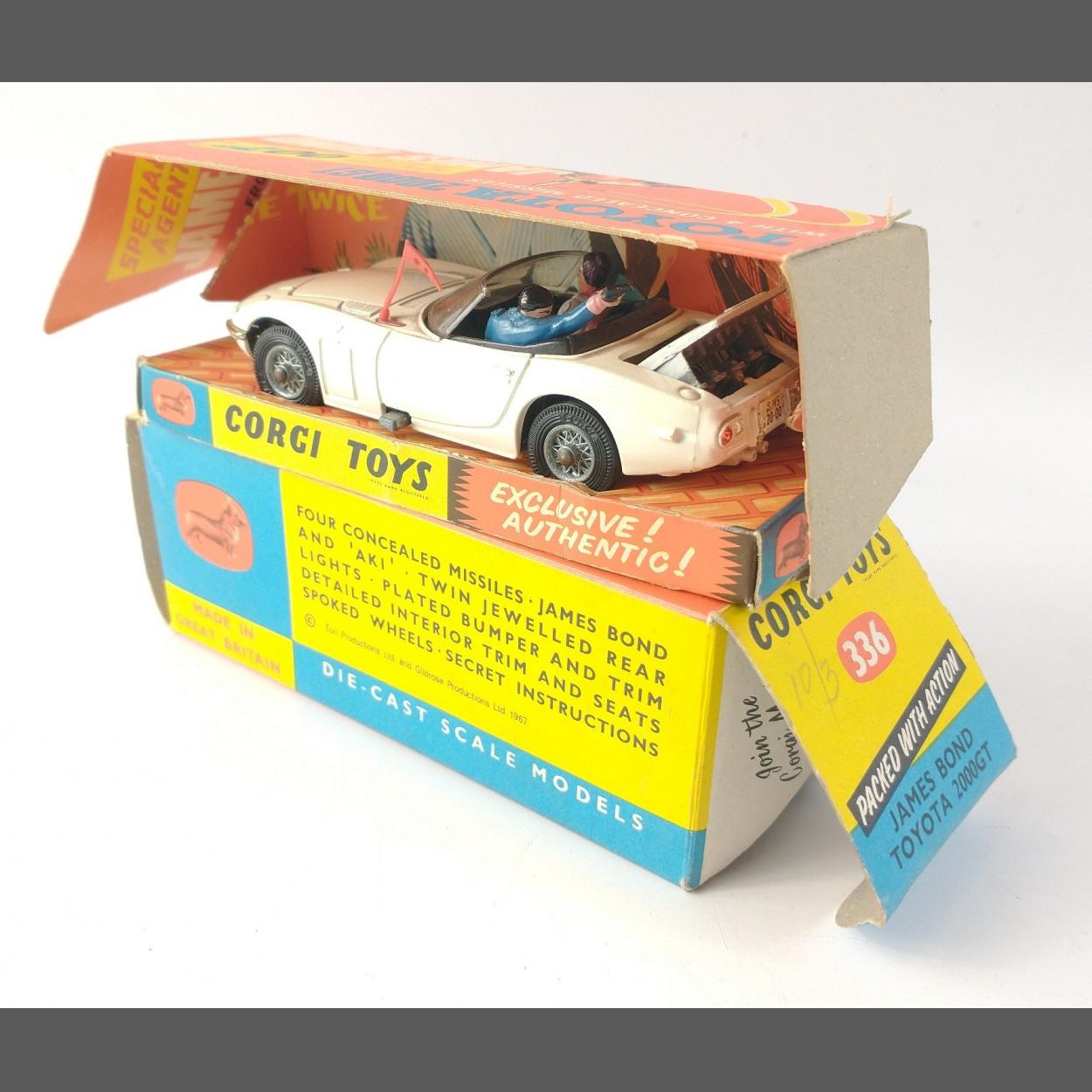 Corgi Toys Diecast 336 JAMES BOND 007 TOYOTA 2000GT in original display box. Missiles supplied in the original separate envelope with instructions. Light pencil mark on the box but overall in very good condition.