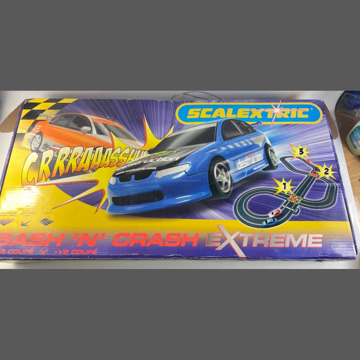 SCALEXTRIC BASH 'N CRASH racing car set. Boxed used set in great condition. Contains both V8 Coupes and comes with track, power unit etc.