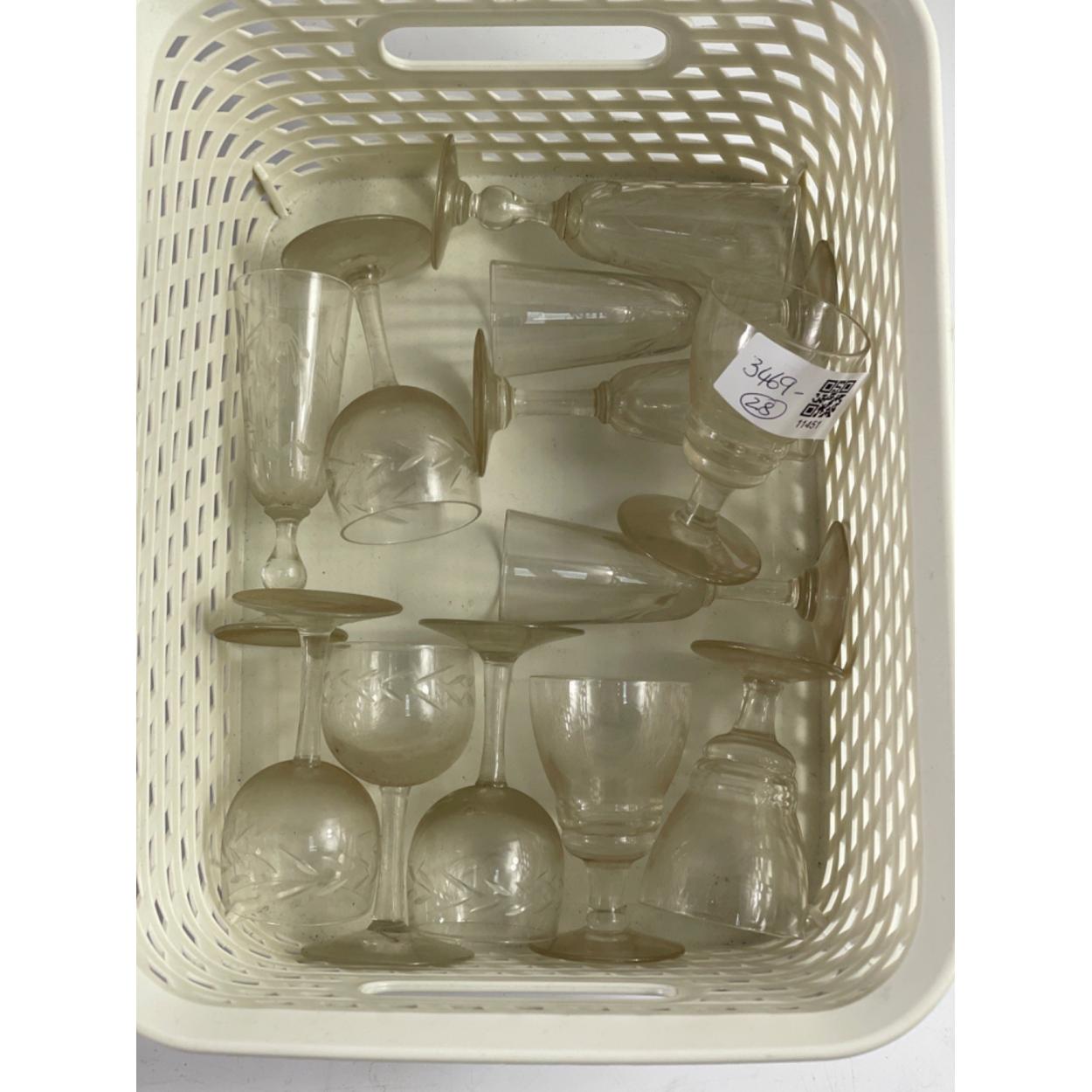 A box full of various glasses including large wine glasses etc