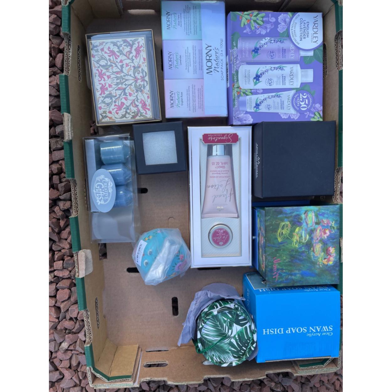 A box FULL of CANDLES, SOAPS, STATIONERY, LADIES TIGHTS, STATIONERY ORGANISERS, CUDDLY HOT WATER BOTTLE and so much more - all new and unused items