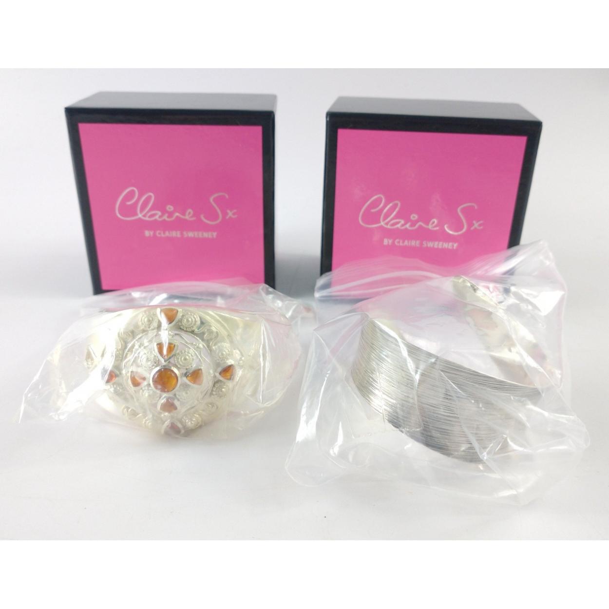 Two silver bangles both stamped 925, by CLAIRE SWEENEY one set with amber coloured stones, gross weight 42.82g approx, the other with a brushed effect, weight 24.35g approx