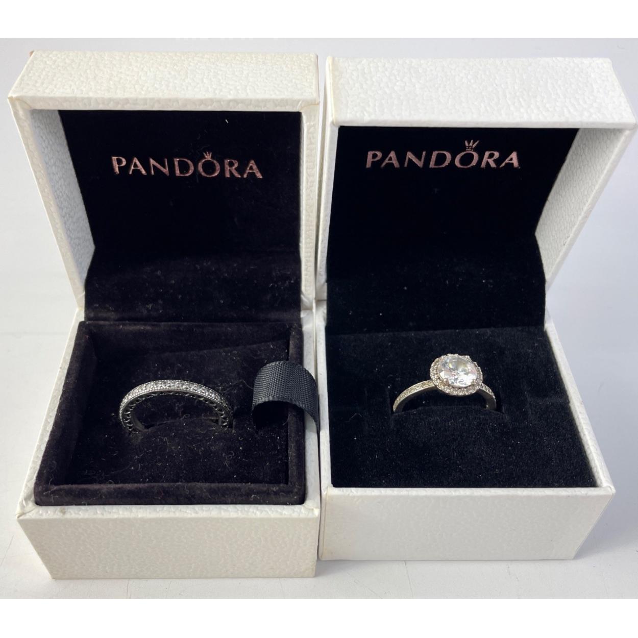 A pair of lovely PANDORA Silver 925 stamped rings in original boxes. Love heart band and a pretty glitzy stone that looks like a million dollars. Both size K.