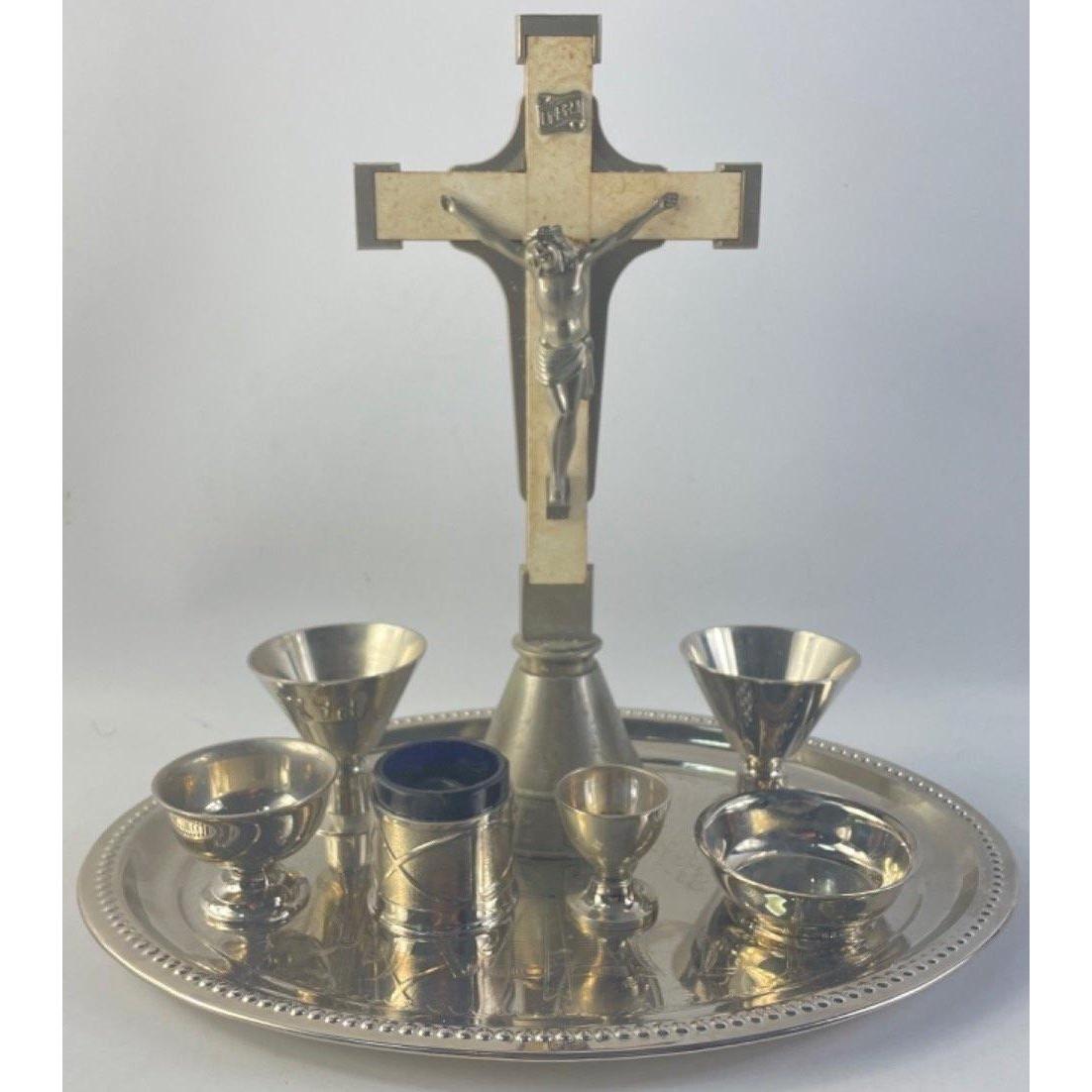 An interesting collection of hallmarked silver to include a creamer and sugar bowl Birmingham 1965, weight 224g approx made by SJ Rose and Son, a sugar shaker 18cm tall, Birmingham 1909, weight 156g approx, a miniature tea and coffee set on a tray (8.5cm dia), Birmingham 1973, weight 66.4g approx, 2 condiment dishes both with blue glass liners and spoons, both Birmingham of different dates, gross weight 130g approx, a mini tankard Birmingham 1971, weight 38.97g approx, a glass perfume bottle with silver collar (faded hallmark), 2 small glass jars with silver lids Birmingham 1934, salt grinder, small cat etc