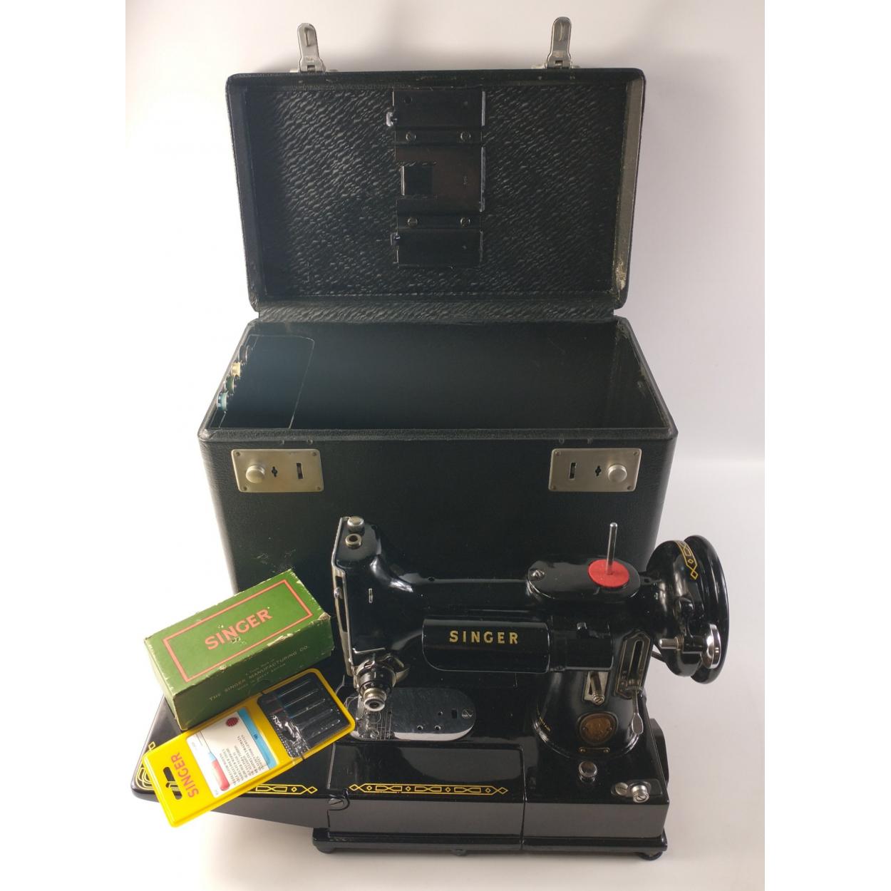 A Brazillian made SINGER sewing machine in hard plastic case. Model n. L47. Case has some damage.