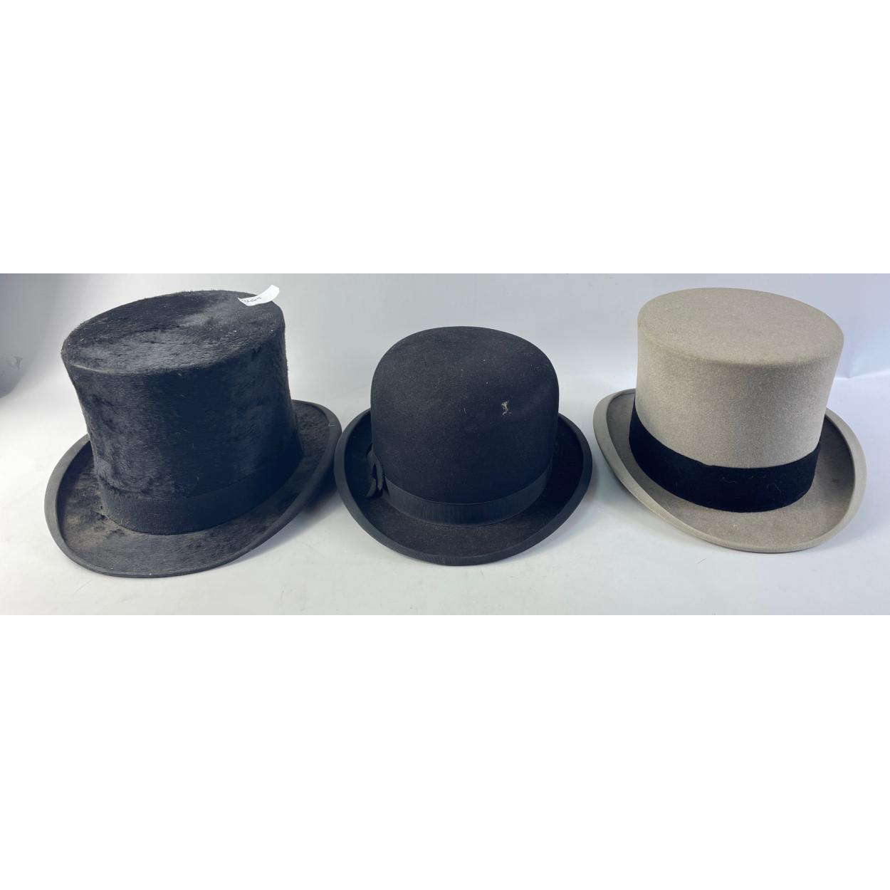 Oh what a toff! - a LINCOLN BENNETT black silk top hat, a size 7 CHRISTY'S of London grey top hat (sold by Forsyth's of Edinburgh) and a black bowler hat by FORSYTH'S of Edinburgh