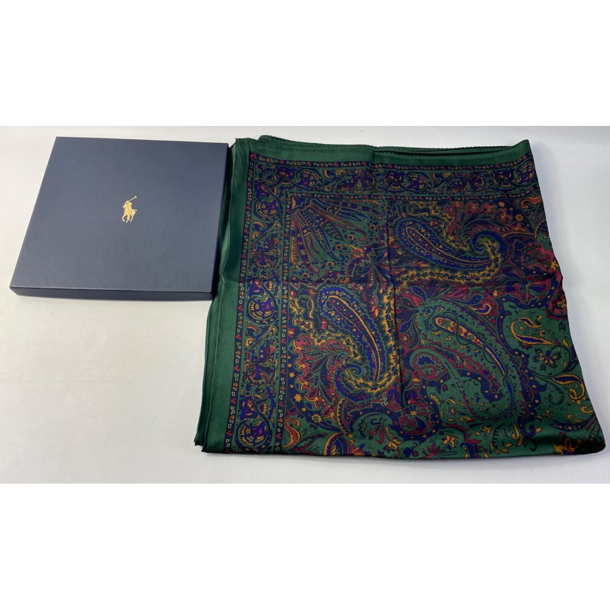 A beautiful RALPH LAUREN POLO Silk Scarf in original box. A lovely Paisley type pattern. Measures 86cm square approx. In good well stored condition with no rips, tears or pulls