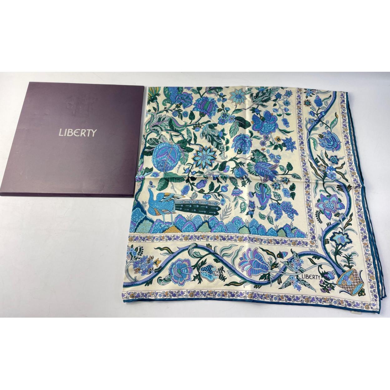A rather lovely LIBERTY Silk Head square / Scarf in original box. A lovely blue flora and fauna pattern. Measures 86cm square approx. In good well stored condition with no rips, tears or pulls