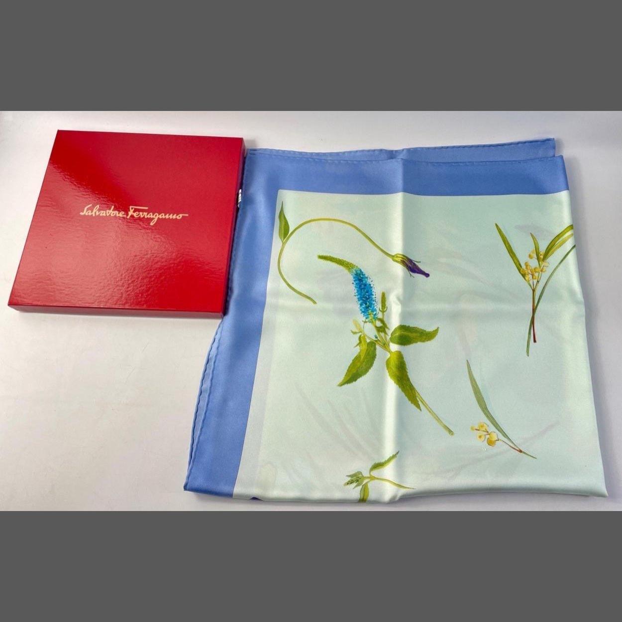 A beautiful SALVATORE FERRAGAMO Silk Scarf in original box. A lovely floral pattern. Measures 86cm square approx. In good well stored condition with no rips, tears or pulls.