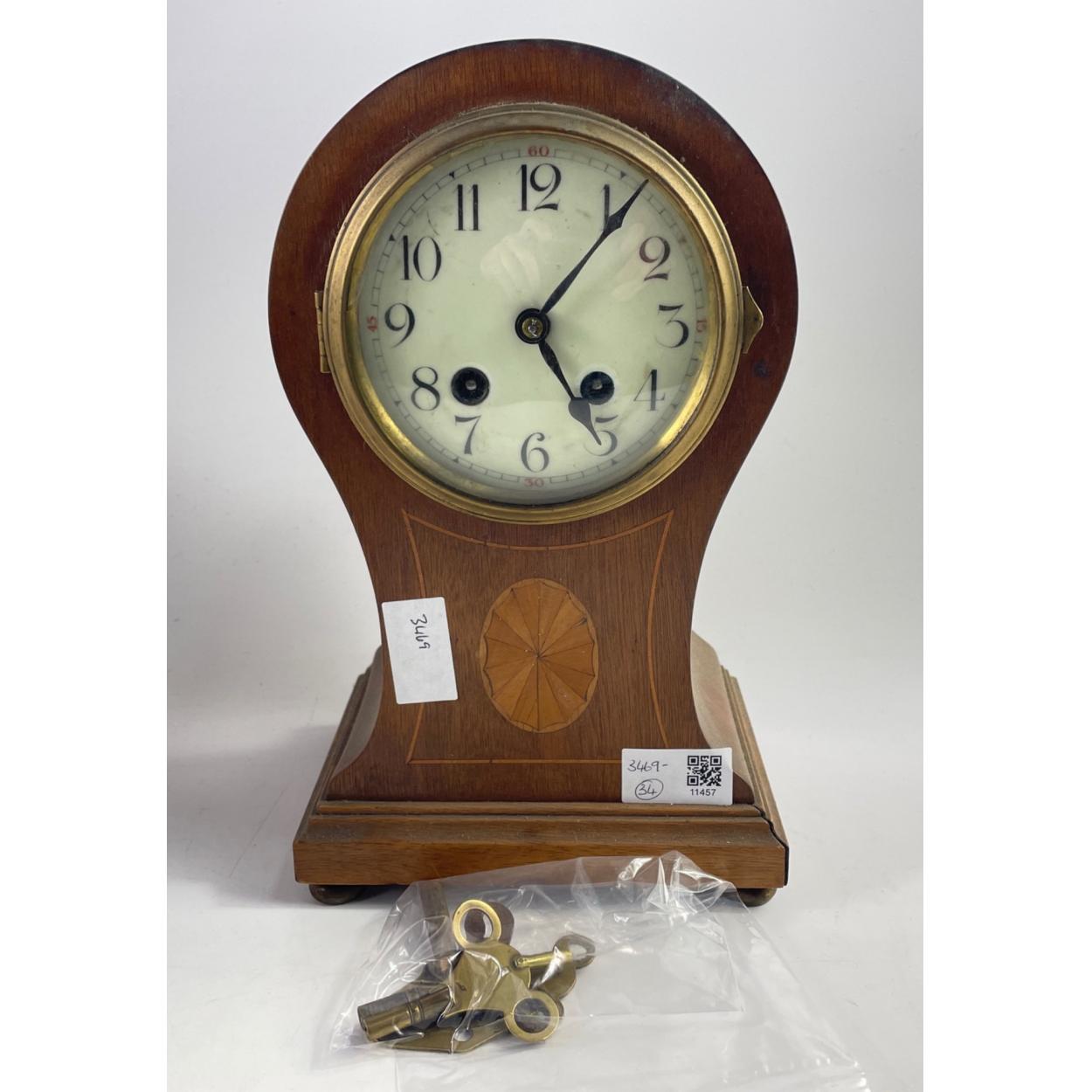 A wooden mantel clock with inlaid front, no maker's mark, stands 29cm high
