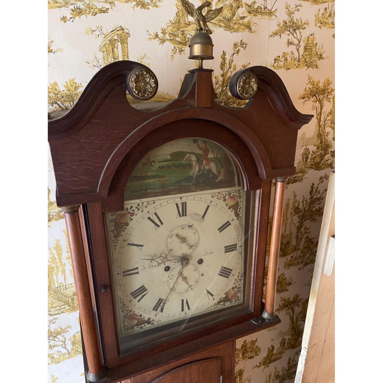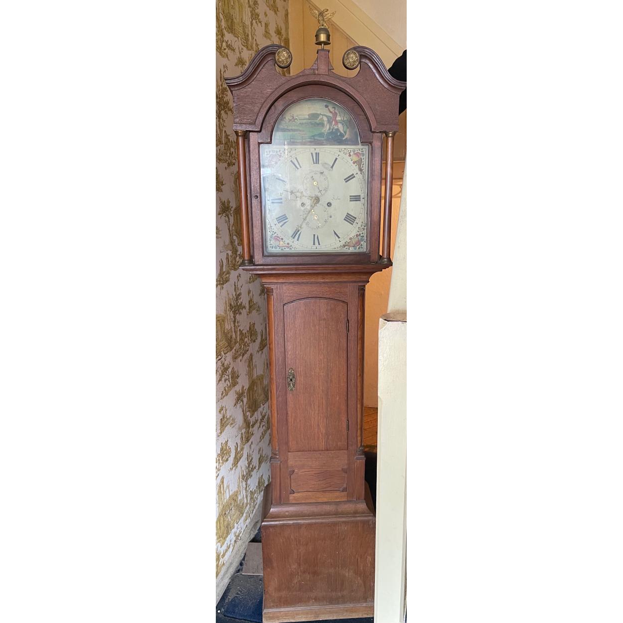 TICK-TOCK - MAYBOLE AYRSHIRE INTEREST ! A Georgian period MAYBOLE (very faint and maker also Thomas Logan) and clock dial made by James Wilson of Birmingham circa 1810 and the hand-painted face circa 1809 - the long case clock with mahogany case is complete with weights and pendulum - the pendulum will require a small repair - COMES WITH ORIGINAL WINDER KEY - dimensions 220cm tall x 50cm width x 25cm depth