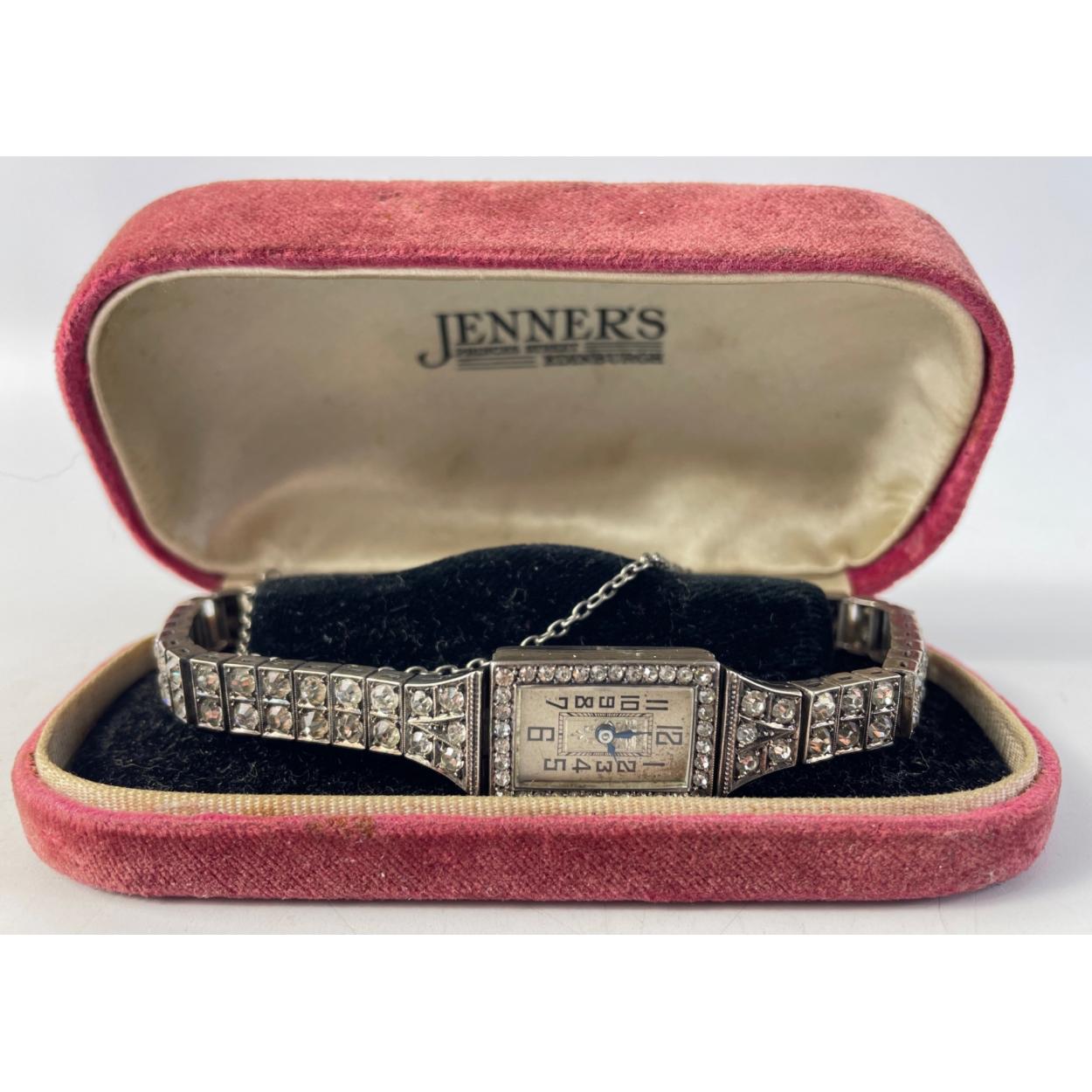 An Art Deco ladies 925 import stamped cocktail watch set with multiple clear stones, nicely presented in a JENNER'S box