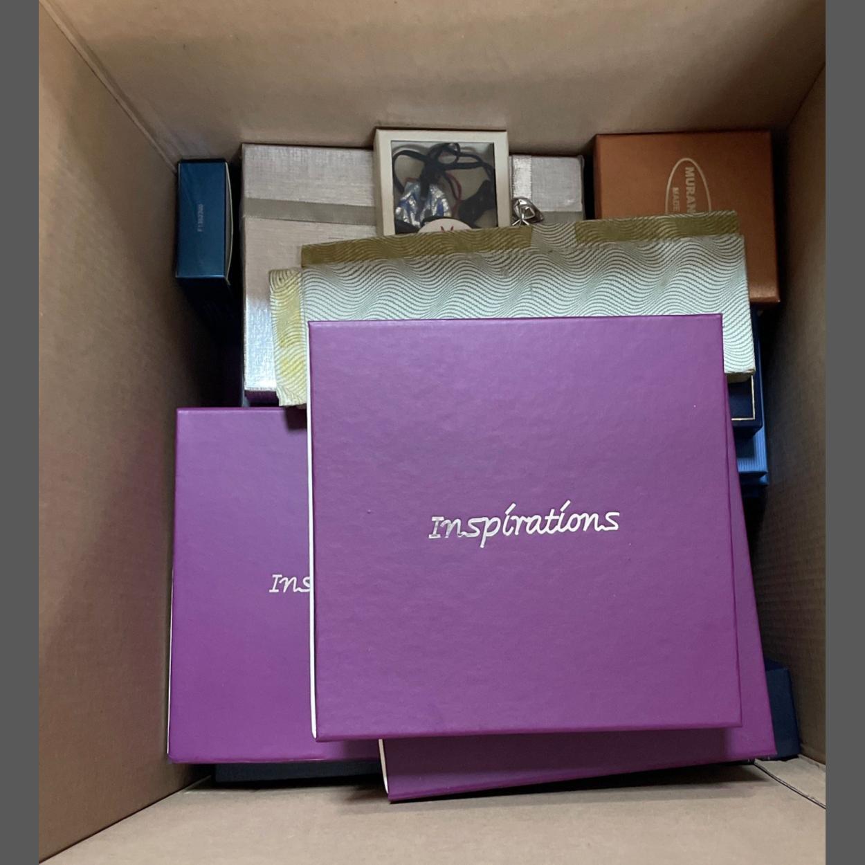 A box full of jewellery boxes to include wooden and leather and of many different sizes and styles