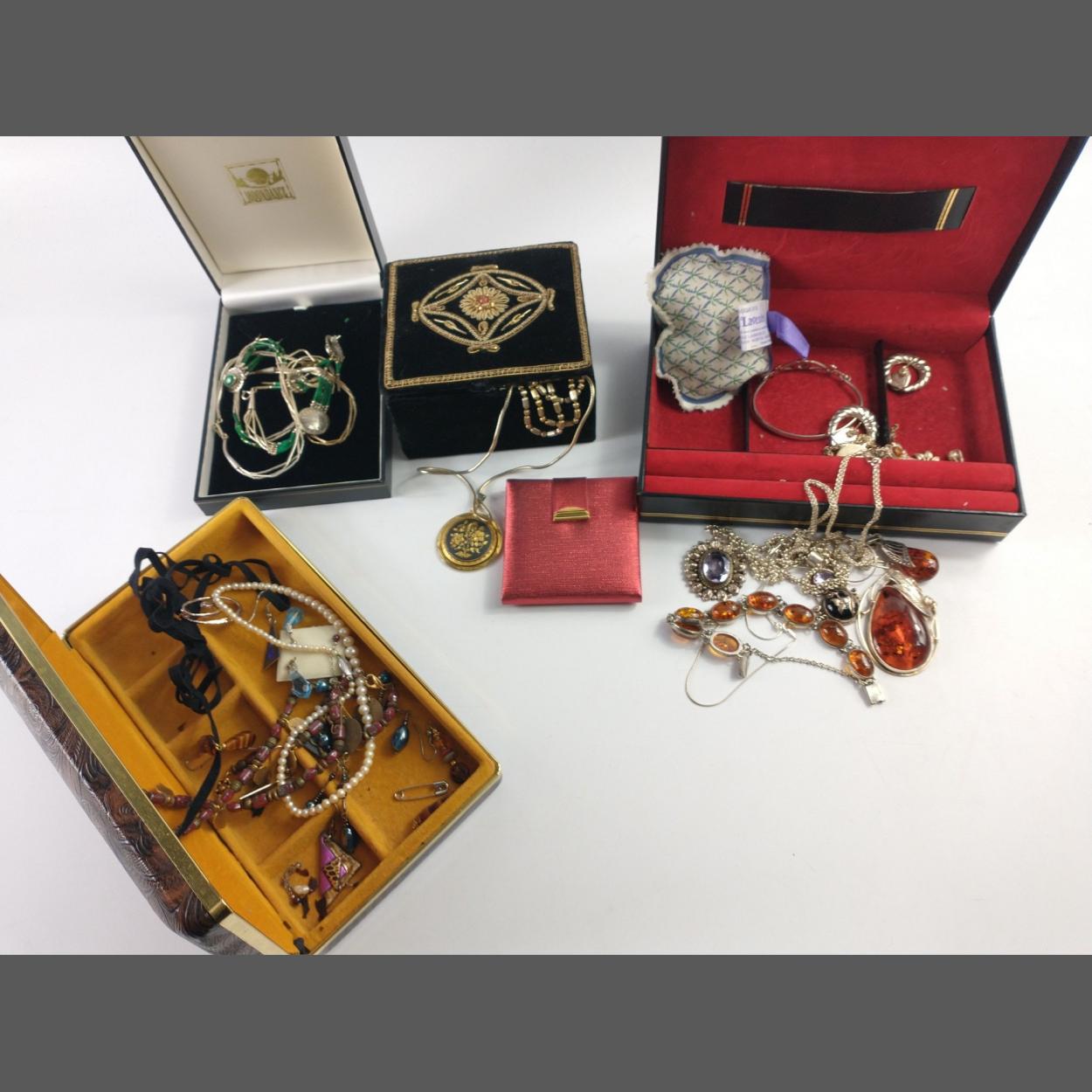 Four jewellery boxes, the first by MELE with contents including some stamped 925, a MOONDANCE suite of necklace, bracelet and earrings stamped 925, a DESIGN PHILIP box with 925 stamped jewellery, and a small velvet box with unstamped jewellery