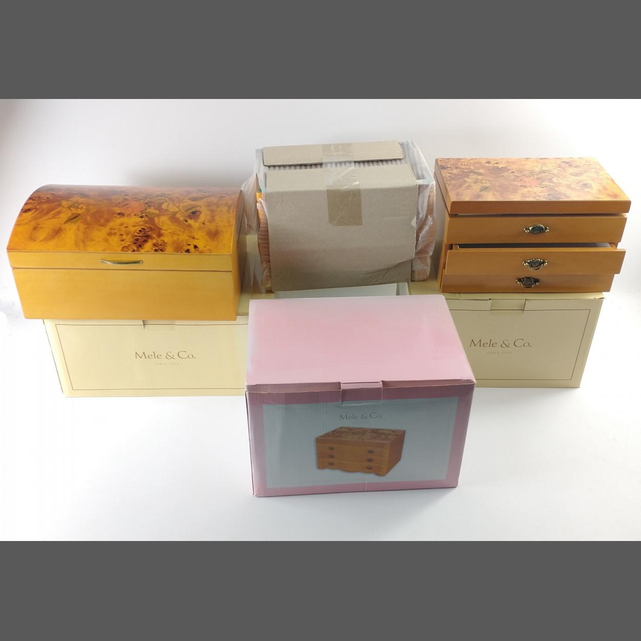 Three new, unused, boxed MELE & CO jewellery boxes with floral inlay oak, one with rounded lid (29x20x13cm), and one chest of drawers style (25x16x15cm),,