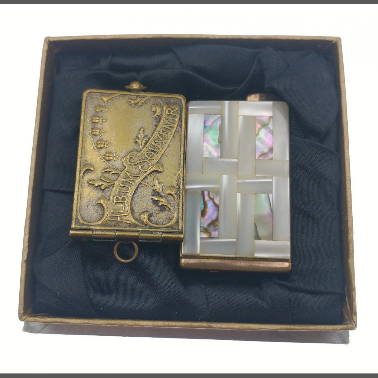 An Art Deco PRIMADONNA rectangular lighter 4x2.5cm with mother of pearl, in original box, plus a miniature vintage picture photo album of Paris 3.5x2.5cm