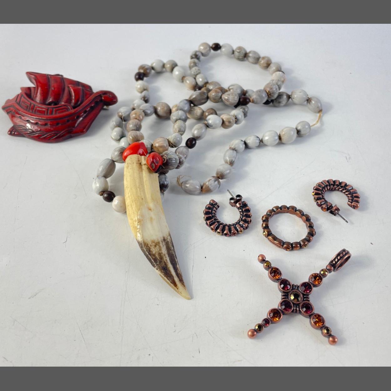 A collection of jewellery to include a DYRBERG/KERN pendant, earrings and ring, a beaded necklace and a carved wooden sailing ship brooch approx 6cm across