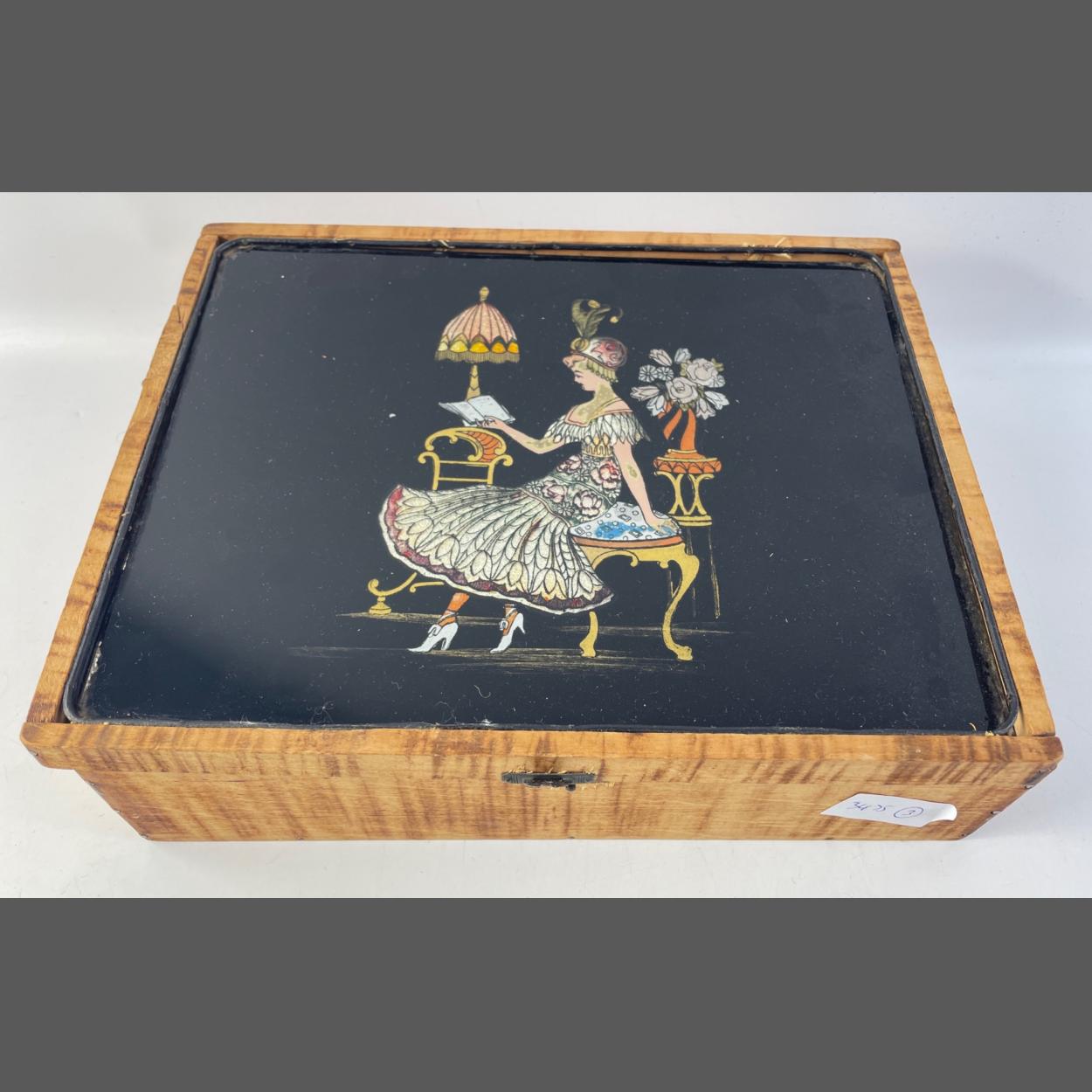 A leather VINTAGE JEWELLERY BOX dimensions 30cm x 19cm x 10cm with and a rickety jewellery box with black glass lid with an image of a lady at ease reading in her parlour, requires a little DIY to bring back to use - dimensions 29cm x 22cm x 8cm depth approx