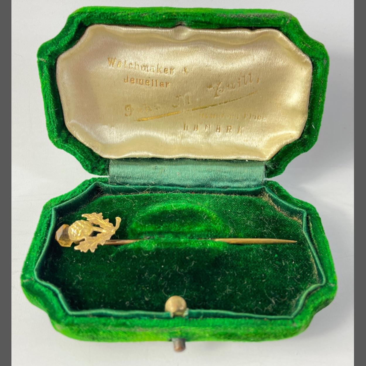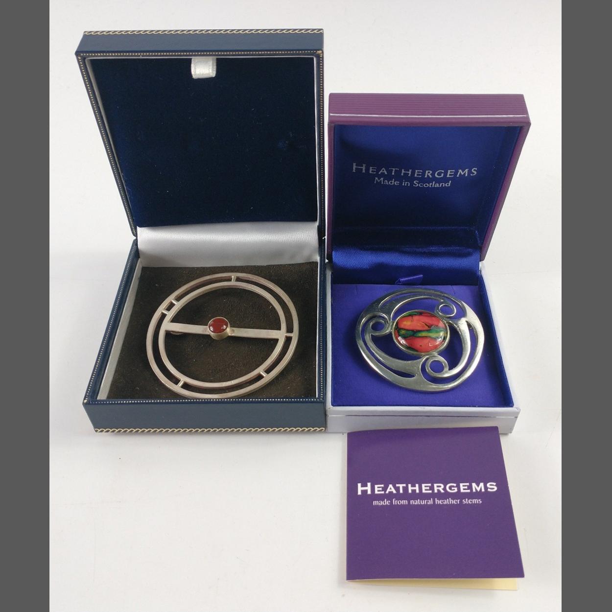 A pair of very attractive modern art brooches in boxes. A Heathergems of Pitlochry stone brooch and an unnamed red centre stone brooch. Both are in good wearable order but would benefit from a gentle clean.