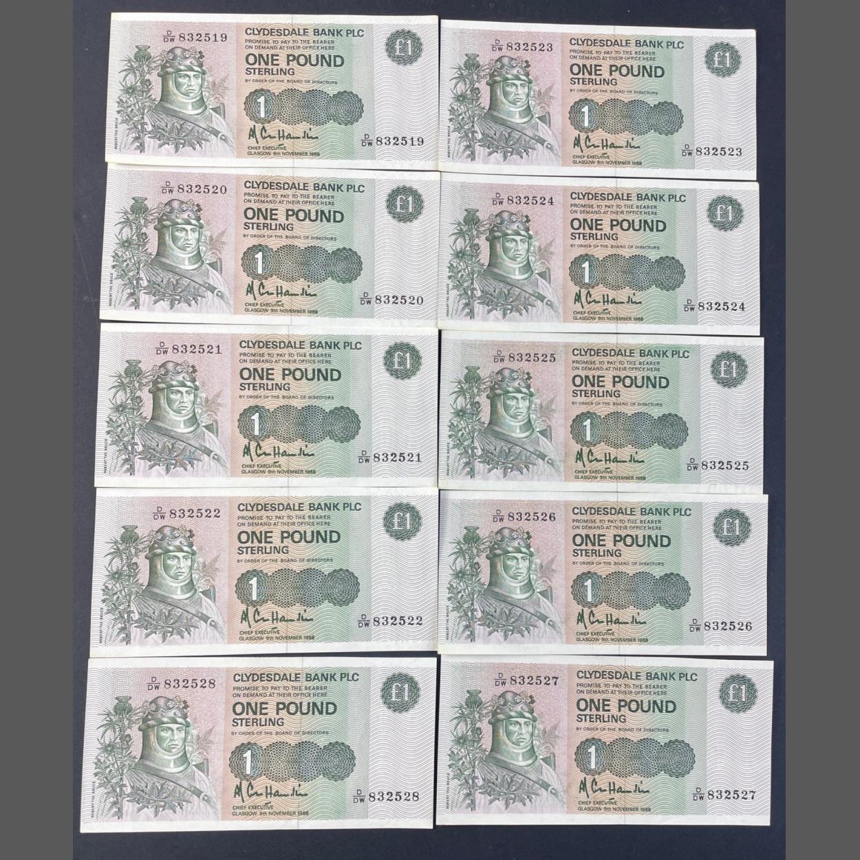 A group of ten 1988 CLYDESDALE One Pound banknotes. All sequential and in collectible grade.