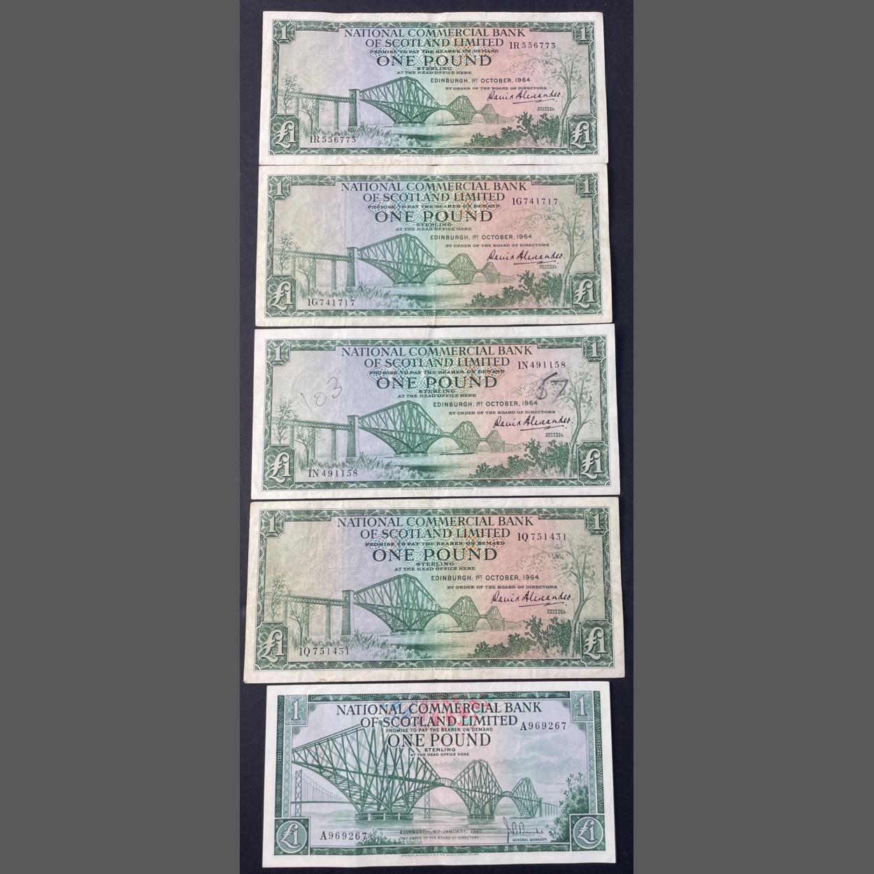 A group of five mixed NATIONAL COMMERCIAL BANK OF SCOTLAND One Pound Forth Bridge banknotes. Consists of four 1964 Alexander notes and a 1968 Burke. All in circulated condition